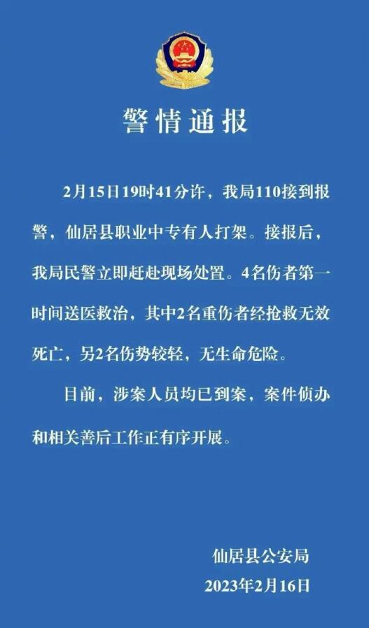 Zhejiang Xianju police: 2 people were killed and 2 injured in a fight in a vocational secondary school, and the people involved were present.