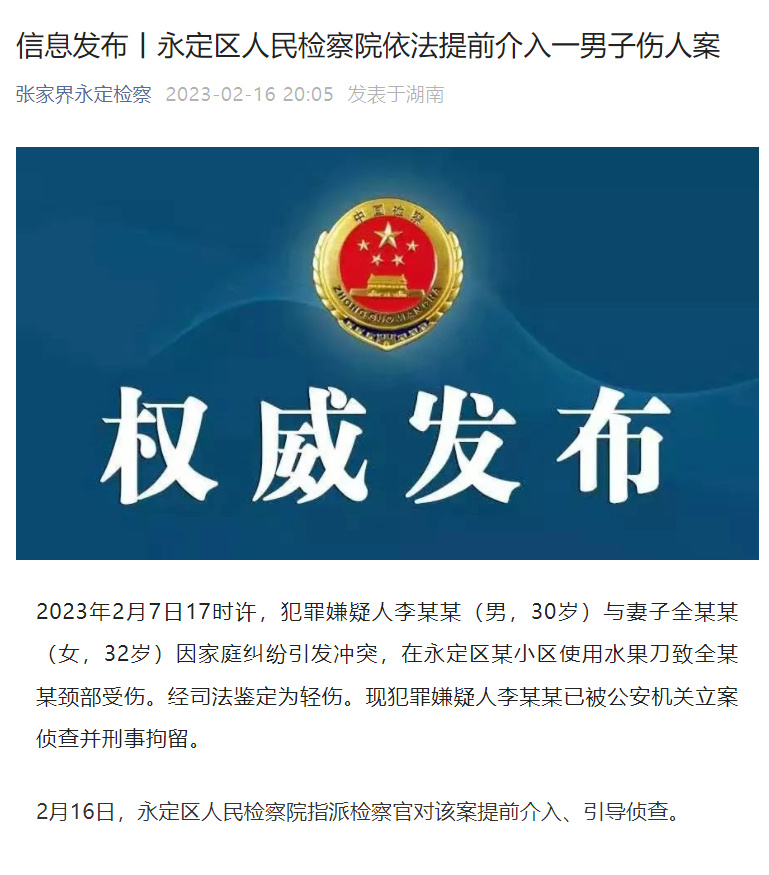 Zhangjiajie yongding county People’s Procuratorate intervened in the case of a man’s wife who cut her throat in advance.